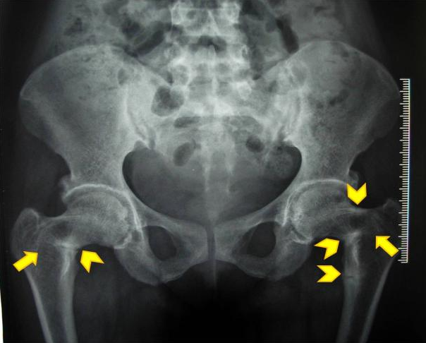 Hình 2. Hình ảnh gãy giả xương đùi hai bên (mũi tên không thân màu vàng) [3].