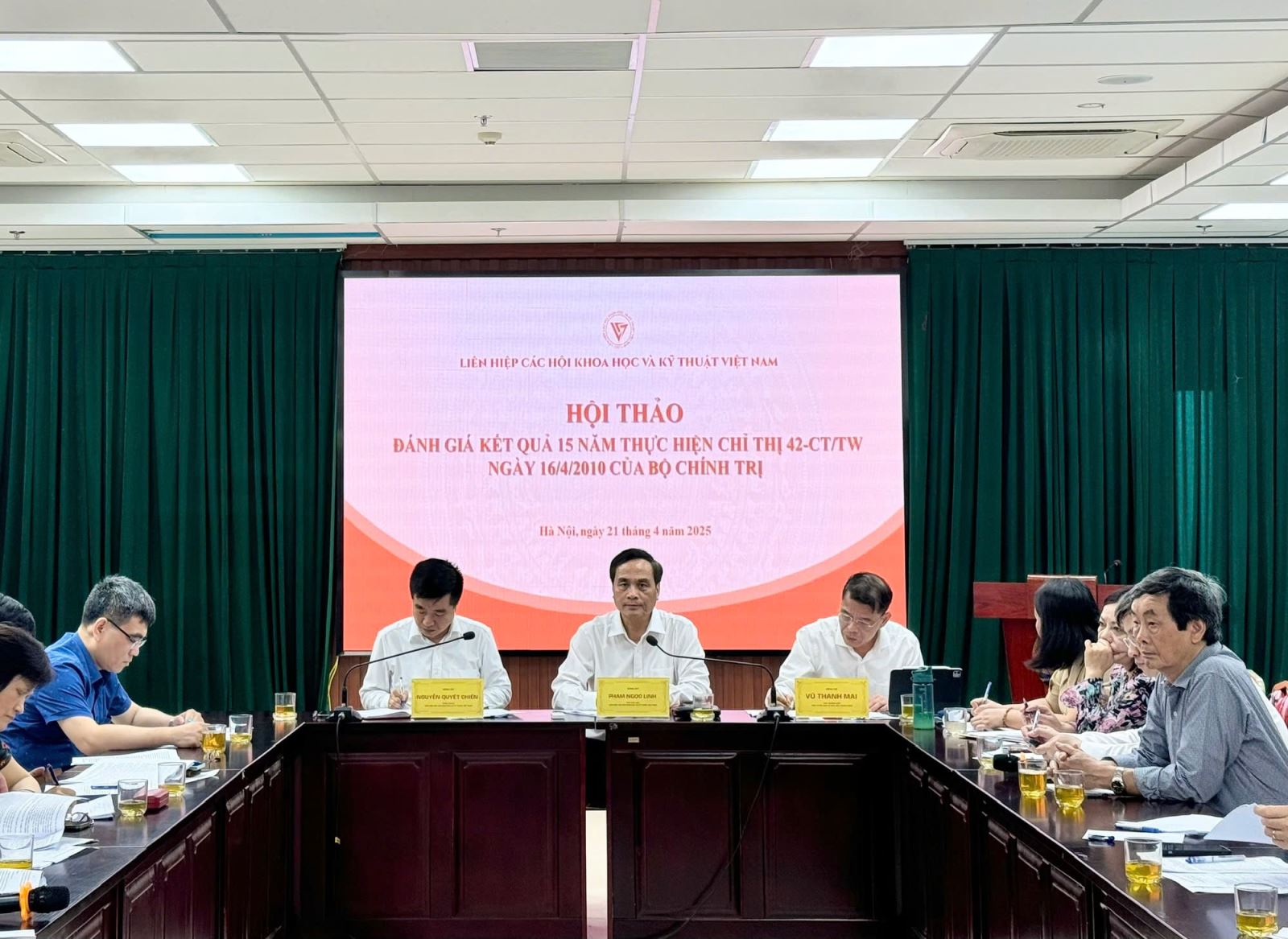 Ngày 21/04/2025, Liên hiệp các Hội Khoa học và Kỹ thuật Việt Nam tổ chức Hội thảo "Đánh giá kết quả 15 năm thực hiện Chỉ thị 42-CT/TW ngày 16/04/2010 của Bộ Chính trị về tiếp tục đổi mới, nâng cao chất lượng, hiệu quả hoạt động của Liên hiệp các Hội Khoa học và Kỹ thuật Việt Nam trong thời kỳ đẩy mạnh công nghiệp hóa, hiện đại hóa đất nước".