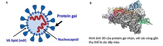 Hình 1. Cấu trúc của SARS-CoV-2 (A) và hình ảnh 3 chiều của protein gai (B).