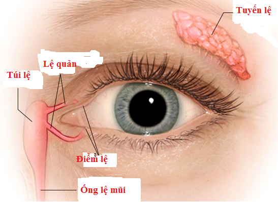 Mắt gồm có nhãn cầu, thần kinh mắt và những bộ phận phụ thuộc như mí mắt, lông mi, các cơ mắt, các cân mạc, tuyến lệ và các màng tiếp hợp... Ở tuyến lệ có bộ phận thoát nước (lệ quản), và nước ở trên bề mặt mắt giữ cho giác mạc và kết mạc luôn ướt. Nước mắt trào ra để rửa sạch bụi bẩn, sát trùng cho mắt. Với kích thước nhỏ so với toàn bộ mắt nhưng cấu trúc tuyến lệ rất tinh vi và được ví như vị “dũng sĩ” bảo vệ cho mắt (hình 1).