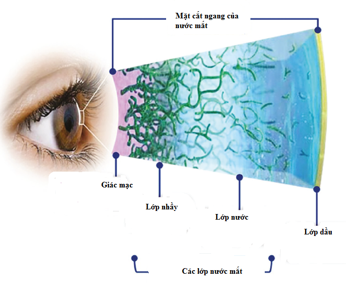 Lớp nước mắt gồm ba phân lớp (hình 3) với ba chức năng khác nhau: i) Lớp dầu có nguồn gốc từ tuyến nhờn bờ mi (còn gọi là tuyến Meibomian) nằm ngoài cùng giúp cho bề mặt nước mắt mướt và giữ cho nước mắt không bị khô đi nhanh chóng; ii) Lớp nước là lớp giữa của nước mắt, là thành phần cấu tạo chủ yếu của nước mắt, giúp làm sạch, quét những hạt bụi nhỏ li ti ra khỏi mắt. Lớp nước có nguồn gốc từ tuyến lệ tại mi mắt; iii) Lớp nhầy có nguồn gốc từ kết mạc, nằm trong cùng, giúp trải lớp nước rộng trên toàn bộ bề mặt mắt, giữ ẩm cho mắt. Nếu không có lớp nhầy, nước mắt sẽ không thể bám lại trên bề mặt mắt. Kết mạc là lớp bao bọc bên ngoài củng mạc (phần tròng trắng mắt) và bên trong của mí mắt. Thông thường, đôi mắt sẽ tạo nước mắt liên tục để giữ cho mắt luôn ẩm. Khi mắt bị kích ứng bởi bụi, chất hóa học, phấn hoa, hoặc khi ta khóc, mắt sẽ tạo ra một lượng lớn nước mắt. Tuy nhiên, khi đôi mắt không tự sản xuất đủ lượng nước cần thiết hoặc khi một trong ba lớp này bị tác động từ các tác nhân bên ngoài sẽ sinh ra khô mắt [5].