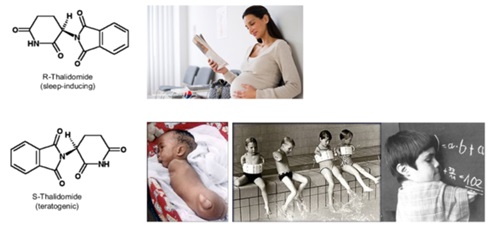 Hoặc thuốc Thalidomide (một biệt dược được sản xuất tại Đức, rất nổi tiếng trên thị trường khi được đưa vào sử dụng năm 1957) được mệnh danh là "thần dược" cho phụ nữ mang thai để điều trị những triệu chứng chóng mặt, mất ngủ, buồn nôn trong giai đoạn ốm nghén. Tuy nhiên, kể từ năm 1961, Thalidomide đã bị cấm sản xuất và lưu hành sau khi hàng nghìn bà mẹ sử dụng loại thuốc này sinh ra những đứa trẻ bị dị tật, gọi là “hội chứng chim cánh cụt”. Thuốc tổng hợp cũng tạo ra 2 đồng phân quang học, gồm: R - thalidomide gây cảm giác thoải mái, không buồn nôn, ăn ngon, ngủ ngon; trong khi, đồng phân S - thalidomide lại gây tác hại rất nghiêm trọng, đứa bé sinh ra có hiện tượng các chi không hoặc kém phát triển (hình 1).