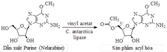 Điển hình khi gắn nhóm acyl lên cấu trúc Nelarabine bằng phương pháp hóa học thì phản ứng thường ưu tiên acyl hóa tại nhóm -NH2 là sản phẩm chính, sản phẩm phụ là các nhóm acyl gắn vào các nhóm -OH trên cấu trúc. Nhưng khi acyl hóa bằng lipase (enzym tách từ nấm Candida antarctica) thì sự acyl hóa có tính chọn lọc nhóm chức cao, chủ yếu gắn lên nhóm 5’-OH trên cấu trúc, các sản phẩm phụ khác tạo ra không đáng kể (dưới 1%) (hình 2).