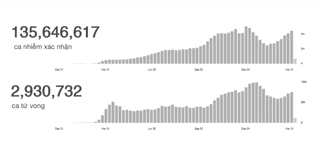 Hình 1. Biểu đồ số ca nhiễm và tử vong do COVID-19 trên toàn thế giới (cập nhật ngày 12/4/2021). Mỗi cột tương ứng với số ca mới trong một tuần (nguồn: WHO).