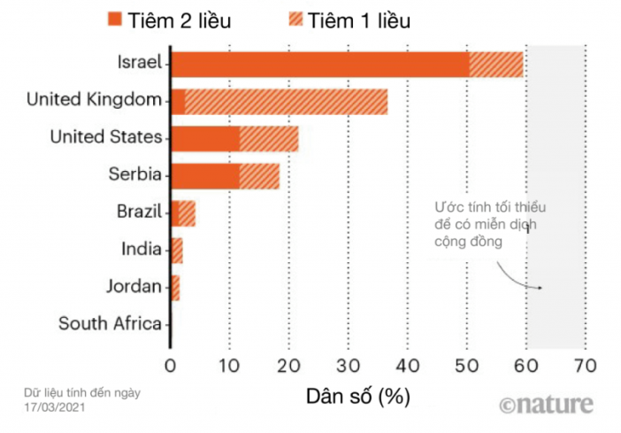 Hình 2. Phân bổ vắc xin ở một số quốc gia, tính đến ngày 17/3/2021 (nguồn: Nature).